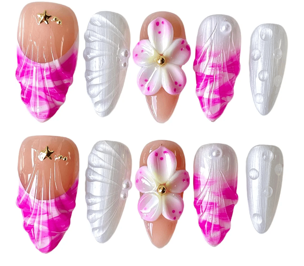 Dive into glam with Barbie Seashells ... a bold mix of seashell textures, pink marble swirls, pearl accents, and 3D florals topped with golden stars.