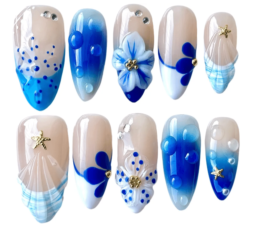 Escape to paradise with Blue Lagoon... a rich mix of ocean blues, seashell textures, pearls, and 3D florals accented with rhinestones and golden starfish.